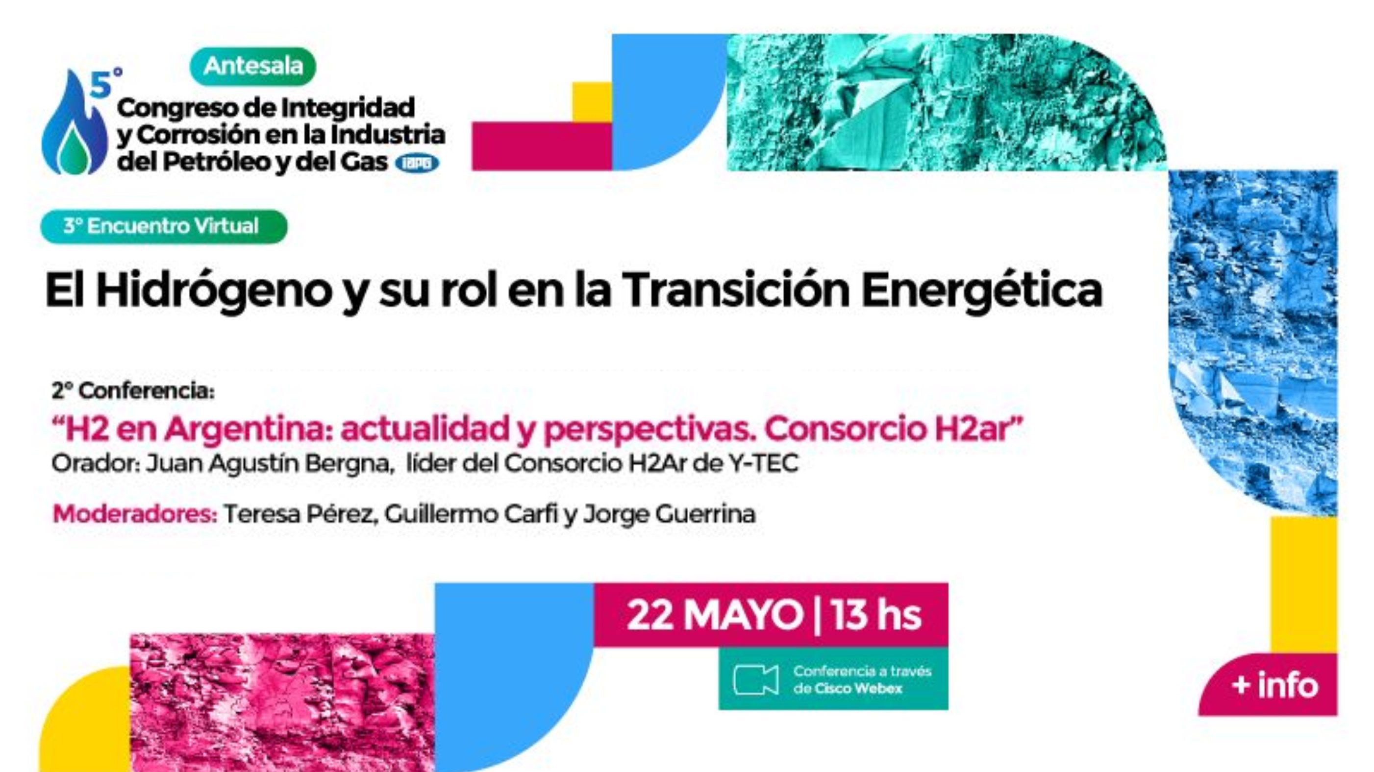 Participamos como oradores en el Webinar: “El Hidrógeno y su rol en la Transición Energética”, junto con Robert Best (UK National Gas Transmission). Esta actividad fue organizada por el IAPG, cómo antesala de cara al 5° Congreso de Integridad y Corrosión de la Industria del Petróleo y Gas. Juan Agustín Bergna, líder del Consorcio H2ar de Y-TEC fue el encargado de la 2º Conferencia del webinar titulada “H2 en Argentina: actualidad y perspectivas. Consorcio H2ar”.